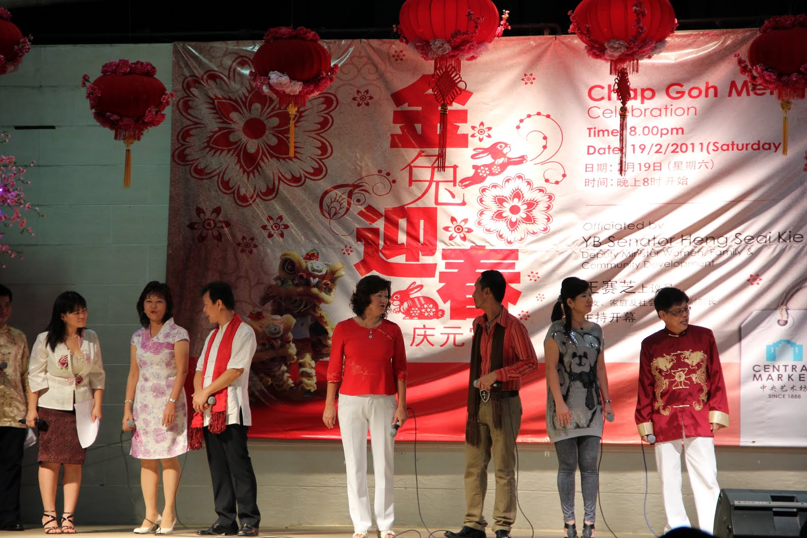 欢乐小组有兴受邀参与马华联邦直辖区和中央艺术坊主办的金兔迎春庆元宵献唱新年歌曲,原本大家高高兴兴准备了1.福气2.声声锣鼓财神到3.好汉歌4贺新年/向歌友拜年/喜喜哈哈过新年,四首歌,哪知道主办当局迟至9点才开始节目,把我们的节目砍!砍!砍!只唱一首歌罢了,害我们脸都黒了一半,真气人……..。